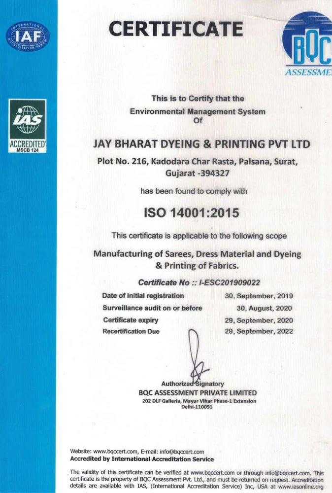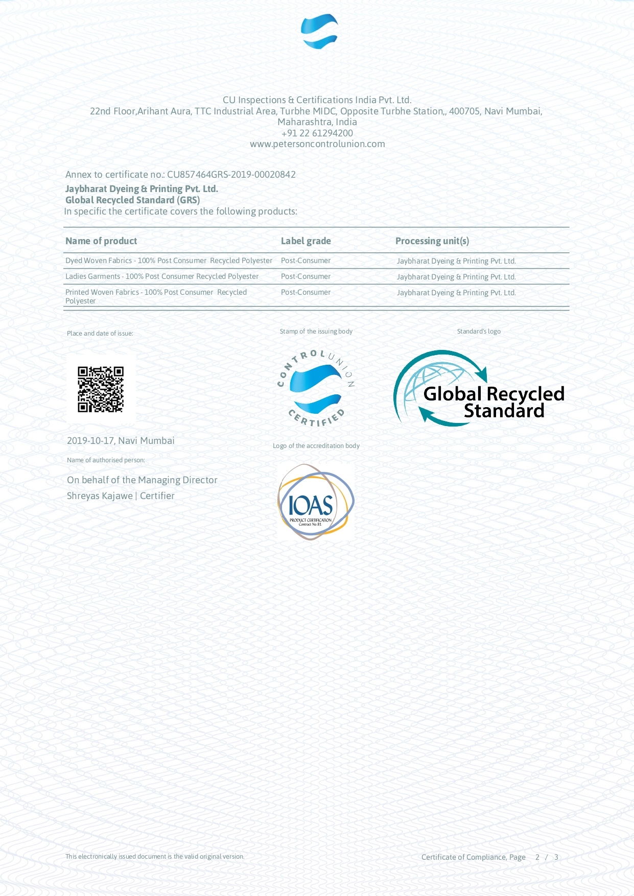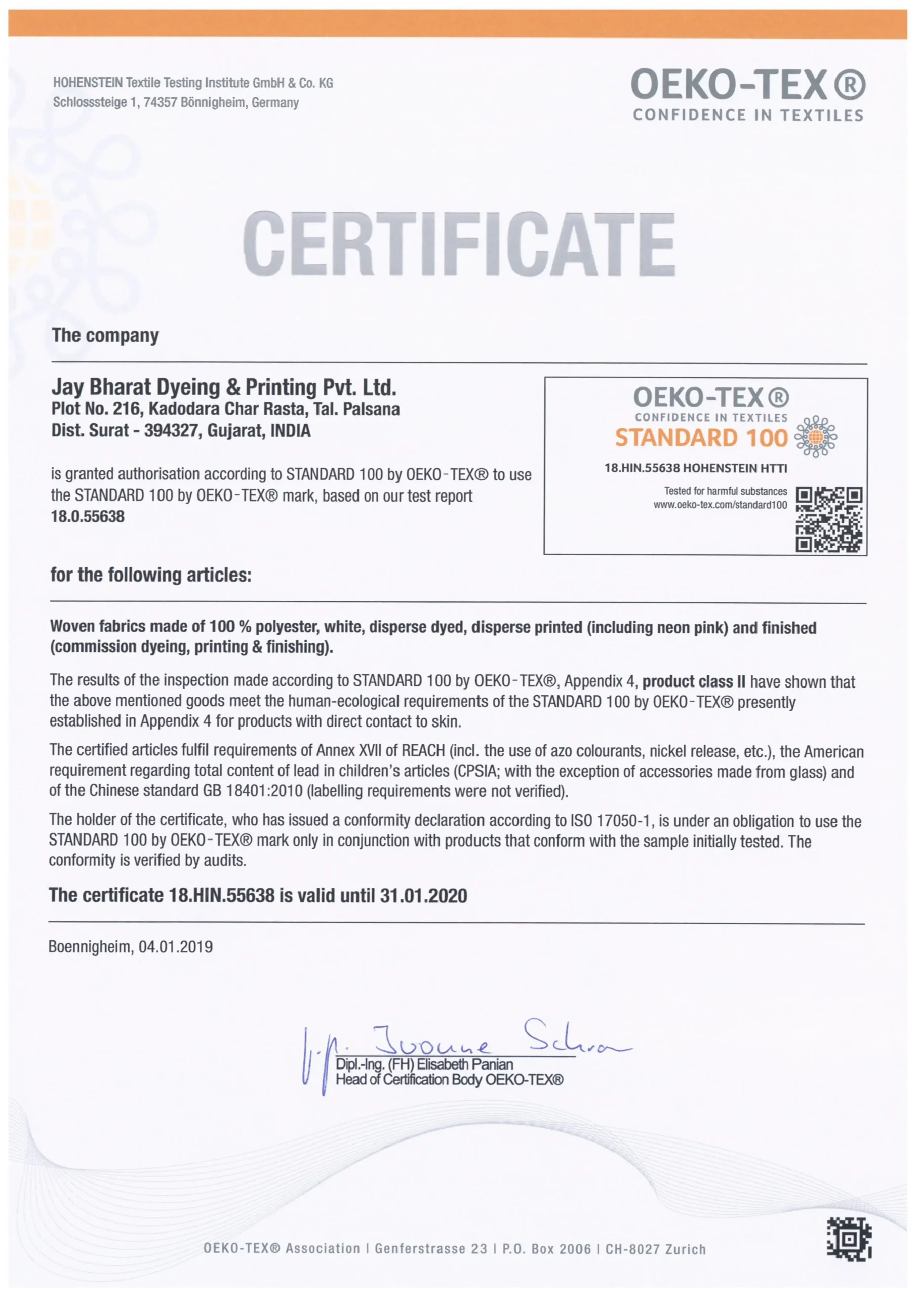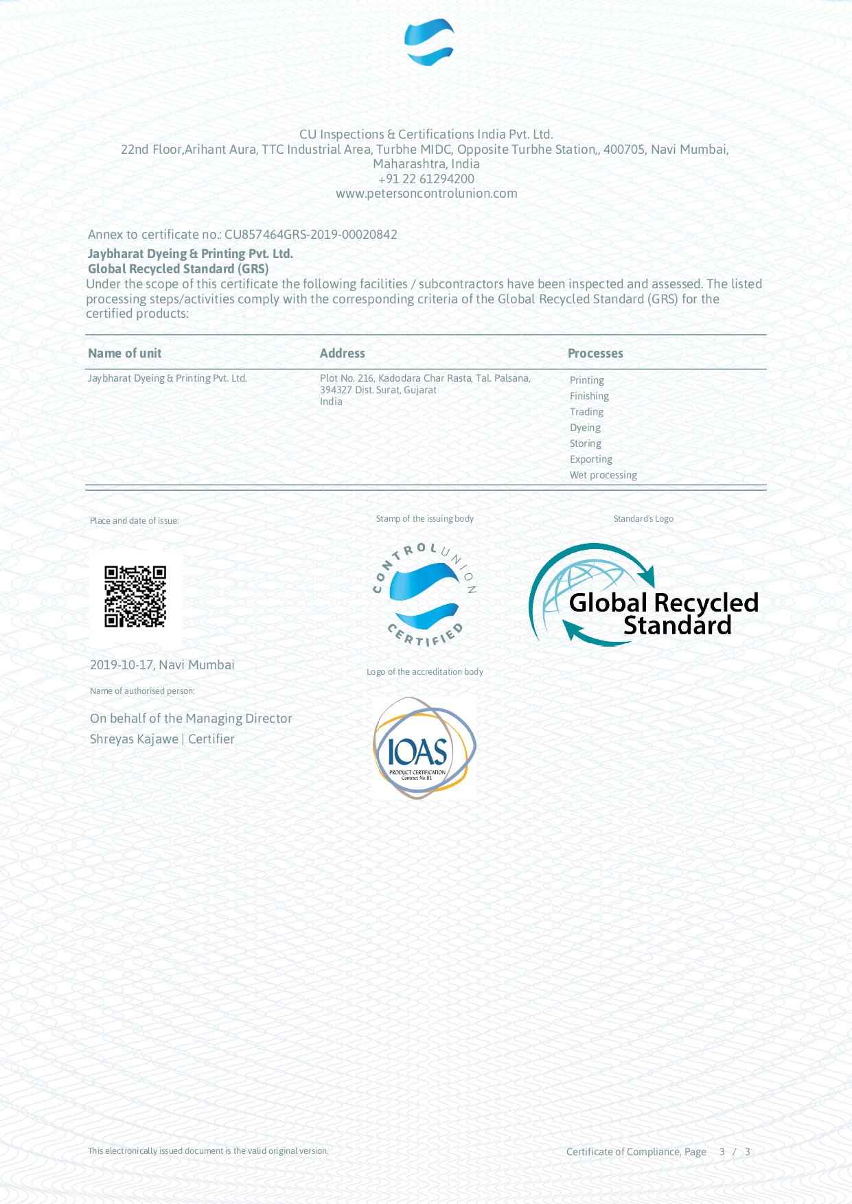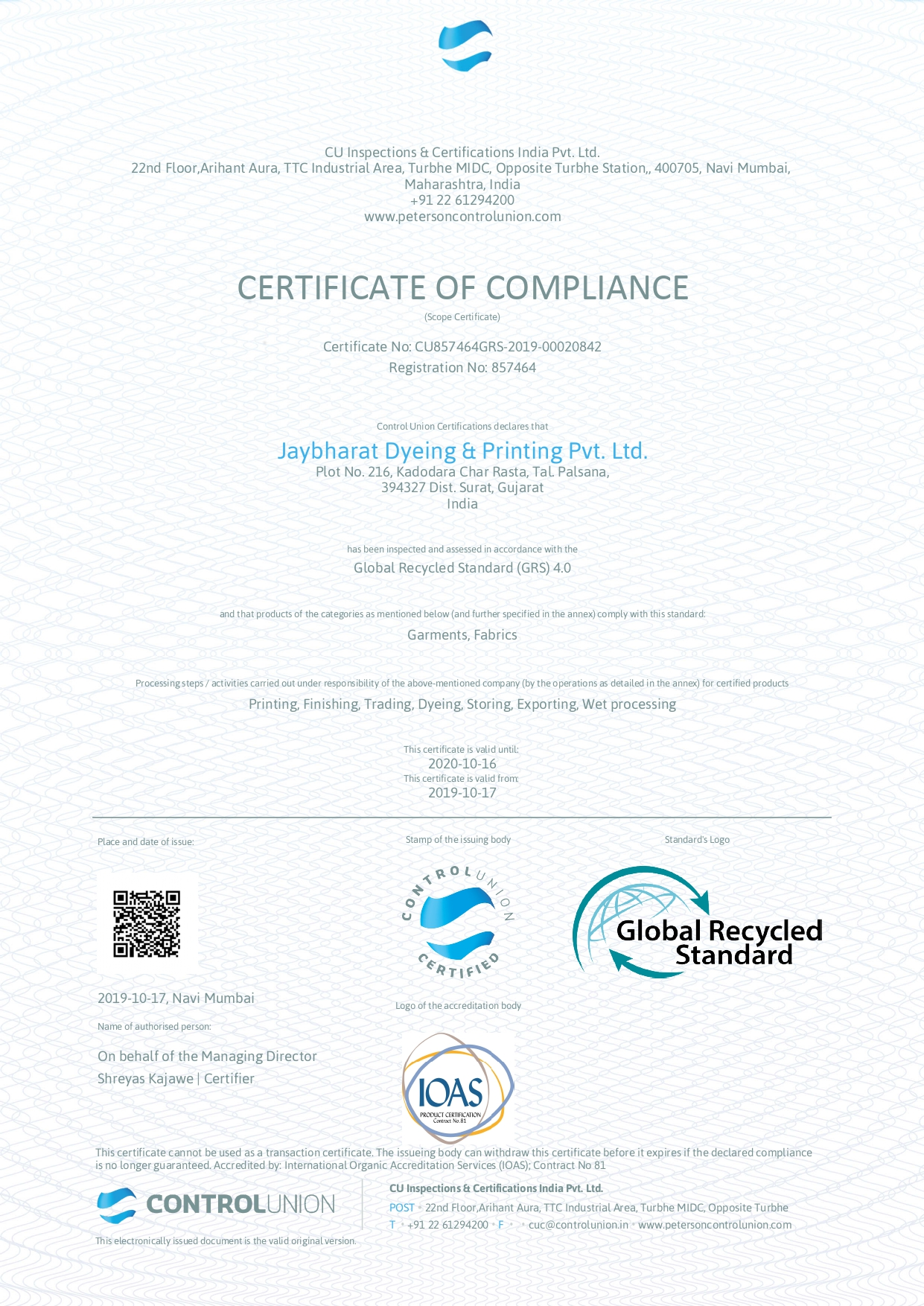 The GRS is an international, voluntary, full product standard that sets requirements for third-party certification of recycled content, chain of custody, social and environmental practices and chemical restrictions. GRS verifies Responsible Social, Environmental & Chemical Practices in Production as well as Recycled Content of intermediate as well as finished products. Jay Bharat is compliant with Global Recycle Standard ver 3.0 since March 2016.